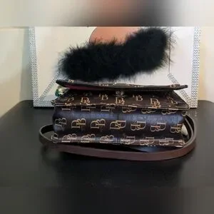 Dooney & Bourke Grace Signature DB Brown Crossbody Bag - Brown Vachetta Leather Trim & Green Fabric Trim... Outside Slip Pocket... 1 Inside Zip Pocket & 1 Inside Slip Pocket... Key Fob Attachment... Red Lining Lightly Soiled... Adjustable Strap...9" x 7" x 3"...