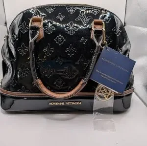 Adrienne Vittadini shiney patent satchel in black with brown trim. Stylish embossed pattern and gold-tone hardware. Top-zip closure and dual handles for easy carry.