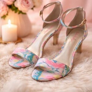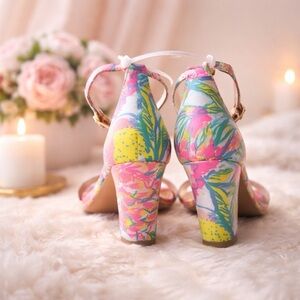 These are like brand-new Lilly Pulitzer heeled sandals featuring a signature vibrant tropical floral print with an elegant ankle strap and gold-tone hardware