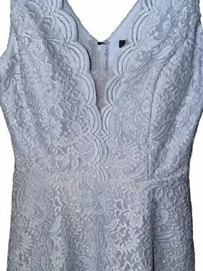 Sleeveless lace dress with a deep V-neck. Scalloped trim along neckline and straps. Fitted waist with a flared skirt. Hidden back zipper closure. Feminine and elegant style. Has a lining underneath with an attached petticoat.