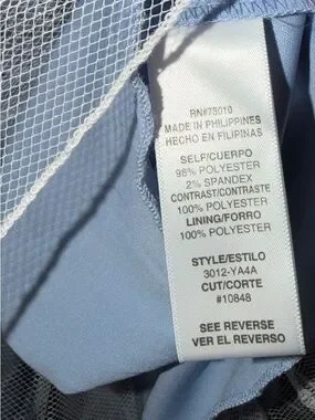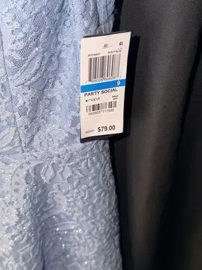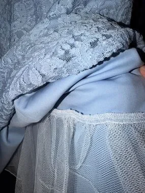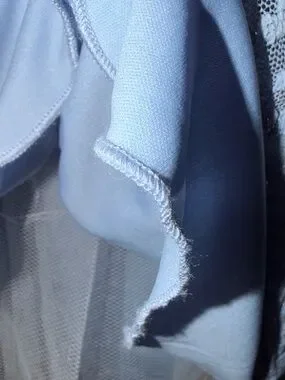 Dress is a beautiful light blue with silver glitter. Pretty neckline which has a mess across the chest line.