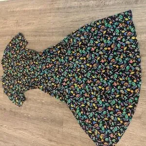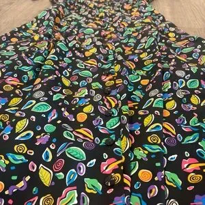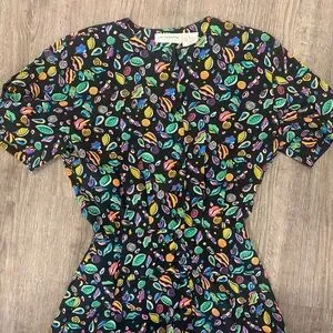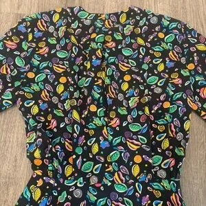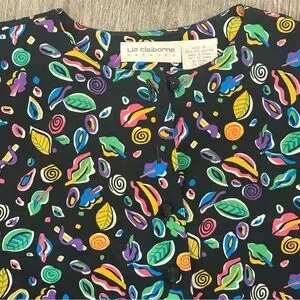 The product is a vintage Liz Claiborne dress from the 90s, featuring a button front maxi sundress in a fit and flare style. This black dress is in size 4 and has short sleeves with a round neckline, making it suitable for both parties and casual occasions. The long dress length adds a touch of elegance to the overall retro 90s theme. Perfect for women looking for a stylish and comfortable dress with a touch of nostalgia.