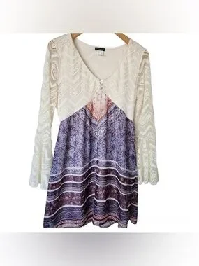 Flattering boho mini dress with a cream lace bodice and patterned purple skirt. Soft V-neck and flared lace sleeves create a feminine silhouette. Lightweight fabric offers comfortable all-day wear. Perfect for casual outings and festival looks. Fairy vibes , beach boho