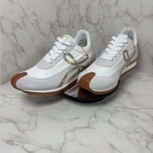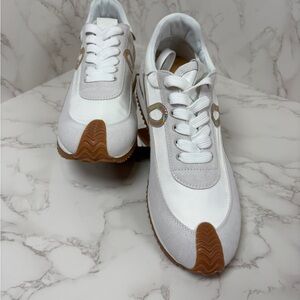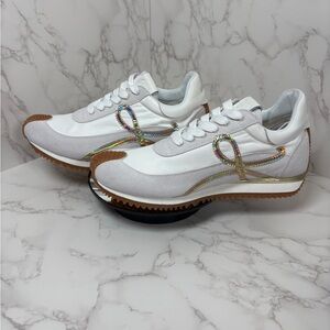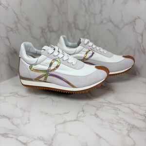 A-1CS-5: GYM SHOES: White & Tan Sneakers w/Iridescent Ribbon Accent, Unisex,NWOT