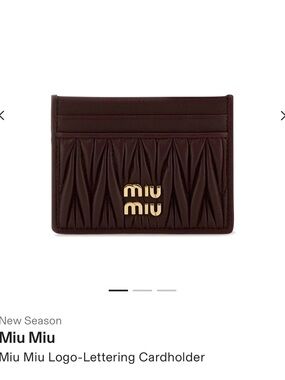 Compact card holder with signature matelassé quilting. Features gold-tone Miu Miu logo. Multiple card slots for organized carry. Luxurious leather finish.