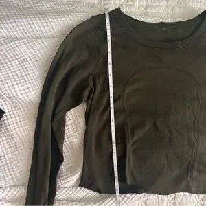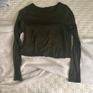Lululemon dark green long sleeve top, fitted silhouette with breathable performance fabric and contour seam detailing. Stretchy, lightweight, and great for workouts or athleisure.