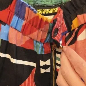 Features: elastic at back of waist, zip closure, pockets, high rise
