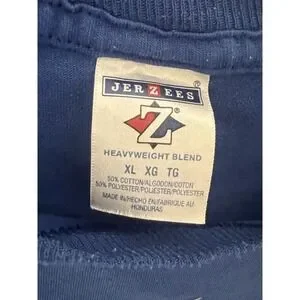 Show your team spirit with this classic Jerzees Men's XL Blue Trojans TD Club T-Shirt. Featuring a bold gold graphic print with 'TROJANS TD CLUB' and '2007' surrounding a football graphic, this shirt is perfect for game day or casual wear. Made from a comfortable heavyweight blend of 50% cotton and 50% polyester, it offers a regular fit and a classic crew neck design. This short sleeve tee is in good condition, ready to be a staple in your wardrobe. Perfect for fans of sports, collegiate themes, or vintage-style apparel.