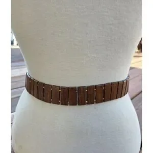 Beautiful wooden link belt featuring natural wood panels joined with gold bead connectors.