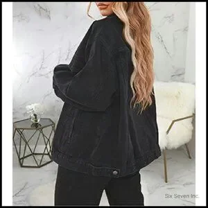 Distressed Oversized Denim Trucker Jacket Women's Long Sleeve Button Up