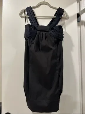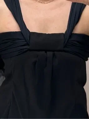 Sleek black mini dress with elegant draped straps for a refined look. Tailored silhouette that flatters the figure and moves comfortably. Versatile style perfect for evening outings and special events.