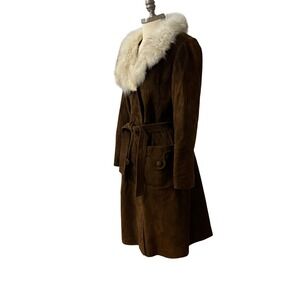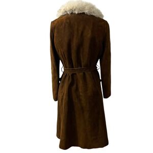 Vintage Brown Suede Trench Coat With White Fur Collar Belted 70s Penny Lane M