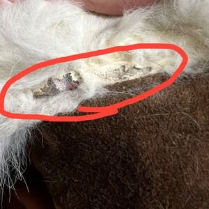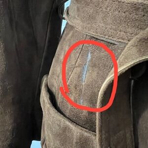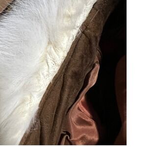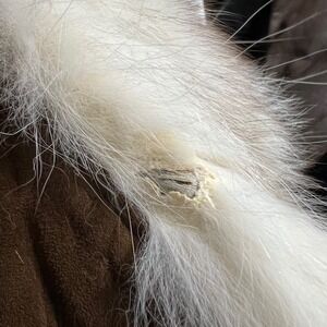 Some damage on interior edges where fur attaches to coat. Not visible when worn and in places where repairs would not be visible. Mark above pocket, see pic. Fur appears to be fox but is not stated. No size tag, use measurements to confirm desired fit.