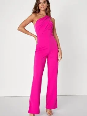 Lulus Devoted To Fun Hot Pink One-shoulder Sleeveless Jumpsuit - Size M