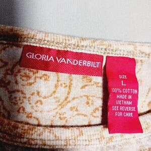 Size L Gloria Vanderbilt T-shirt in soft 100% cotton featuring a Café de Paris graphic with gold metallic accents and a warm vintage-inspired palette. Artful and eye-catching with a romantic European feel that is perfect for effortless styling with denim or layered looks.