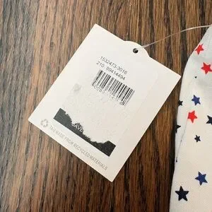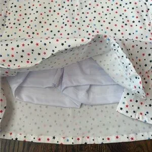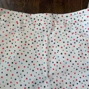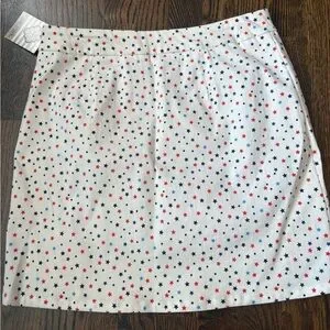 Kate Park white skort with red and blue stars in womens size small. Skort has built in shorts underneath. Front pockets. Stretchy. 77% rayon, 20% nylon, 3% spandex. Measures 16 3/4" long and the waist is 15" across. Brand new with tags, but tag had a previous price sticker removed which tore some information off (see pic).