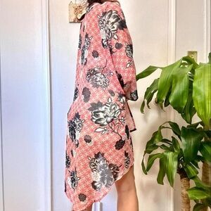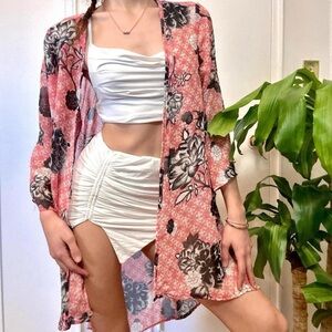 Add a touch of boho flair to your wardrobe with this airy kimono wrap, boasting a beautiful coral floral pattern.