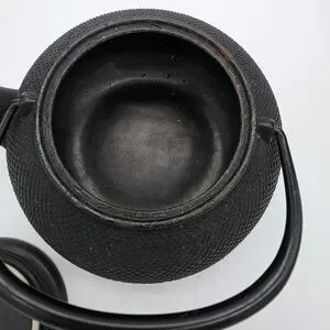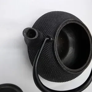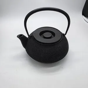 Traditional cast iron teapot with textured body. Removable lid and sturdy handle. Elegant matte black finish. Great for tea service or display.