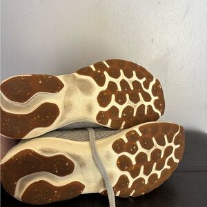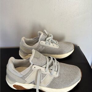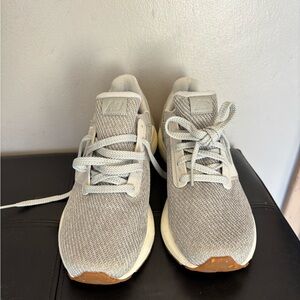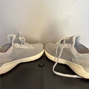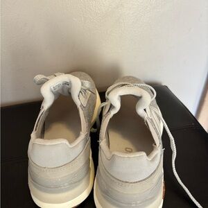 Light gray mesh and suede upper. Cushioned midsole for comfort. Lace-up design for secure fit. Rubber outsole for traction.