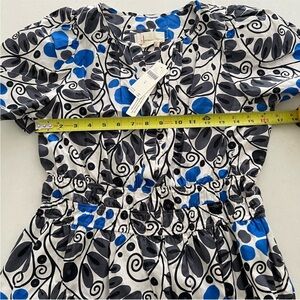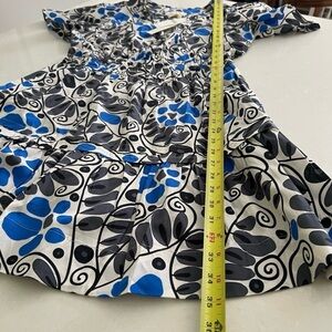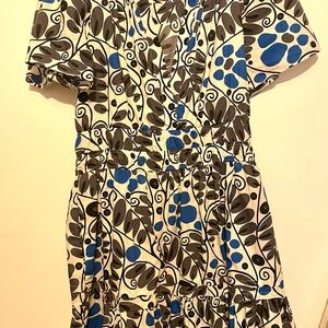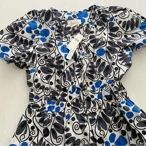 Cotton size small short Somerset dress with bold black swirl and dot print accented by cobalt blue spots. With pockets! V-neck with subtle button detail. Lightweight and breezy for easy wear. Modern graphic pattern with artistic flair.
