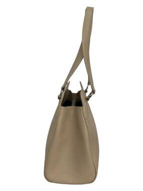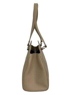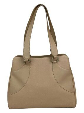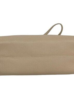 This is an authentic Bvlgari Icare tote in a pink beige leather. The bag features a structured shape, dual top handles, and hardware embellishments that complement the elegant leather construction.