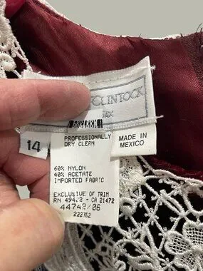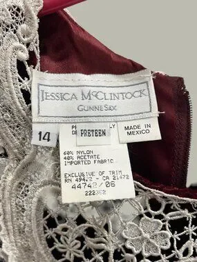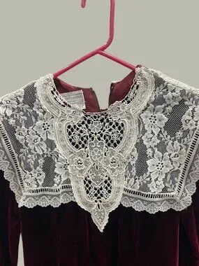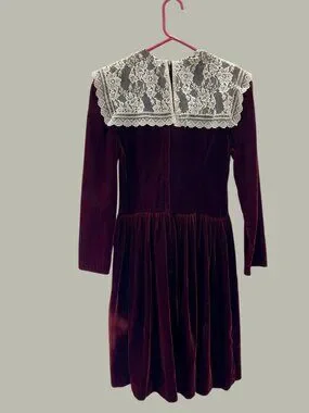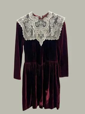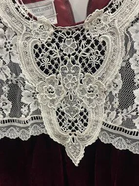 Vintage Gunne Sax Deep Burgundy Velvet Dress w Ivory Lace Yoke, Size Preteen 14