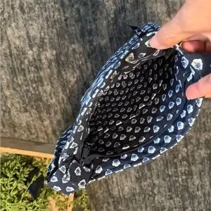 Quilted Vera Bradley crossbody in navy. Front zip pocket with decorative patterned trim. Adjustable blue and white patterned strap. Compact and easy for everyday wear.