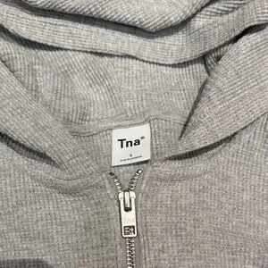Cozy light gray hooded sweater with a cropped fit. Soft knit fabric for everyday comfort. Ribbed cuffs and hem for a polished look. Easy to layer and style for casual outfits.