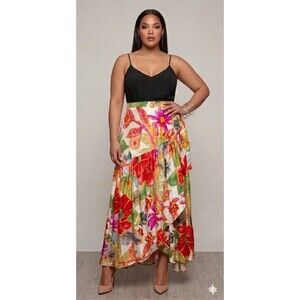 Keywords: Cynthia Rowley, wrap skirt, tropical, floral, hibiscus, botanical, high low, asymmetrical, ruffle hem, boho, bohemian, vacation, resort wear, beach, summer, colorful, multicolored, bright, midi skirt, maxi skirt, feminine, romantic, flowy, designer, rare, eclectic, festival, satin, silky