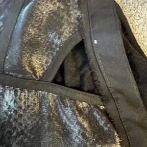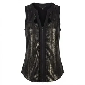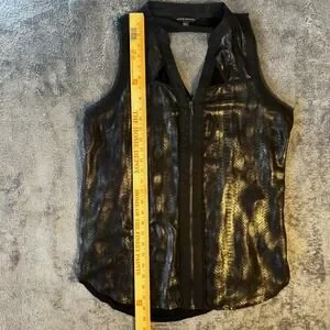 Rock & Republic sleeveless top featuring a bold metallic gold snakeskin foil print on the front and a solid black jersey back. This edgy piece is designed with a full-length front zipper, a V-neckline with triangle cut-out details, and a stylish back keyhole opening. The curved hem and lightweight fabric make it a versatile choice for a night out or adding a rock-inspired touch to a casual look. Note that there is some minor fraying around the raw-edge trim details as shown in the photos.