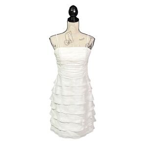 Elegant white tiered mini dress with delicate spaghetti straps. Soft ruched bodice and layered skirt create a flattering silhouette. Lightweight fabric for comfortable all-day wear. Stylish choice for parties and special occasions.