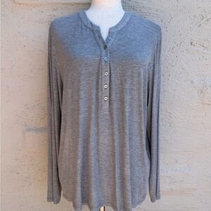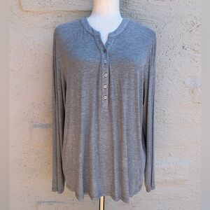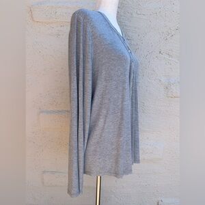 Calvin Klein ribbed jersey top in heather gray. Crew neck with buttons 1/2 way down the front. Refer to measurements.