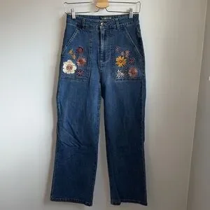 ModCloth x Princess Highway Floral Embroidered Wide-Leg Jeans SZ 8