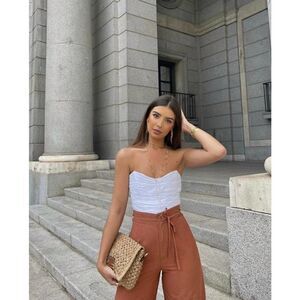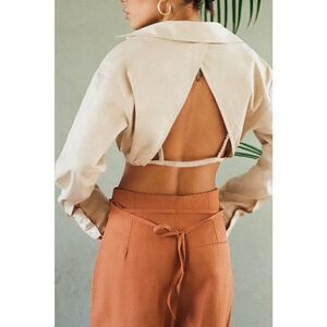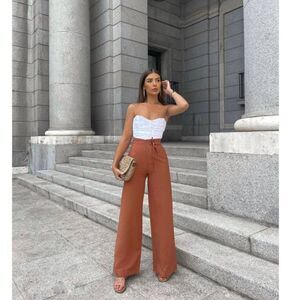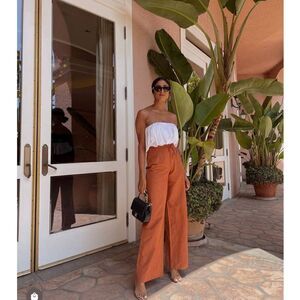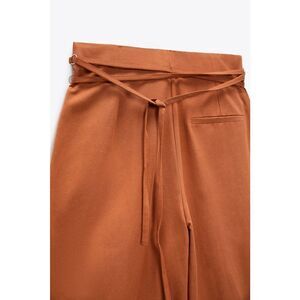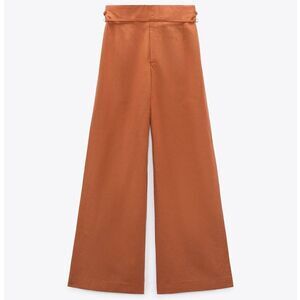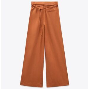 Pants made of linen blend fabric. High waist and wide leg. False back welt pocket. Tied self belt. Front zip closure.