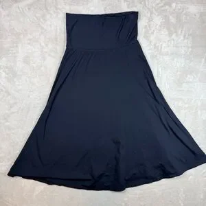 Black Patagonia midi-length skirt with a flattering A-line silhouette and foldover waistband. Soft, stretchy fabric makes it perfect for everyday wear, travel, or athleisure styling.