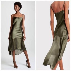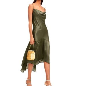 A breezy hem creates fluid movement on this slip dress. Square neck. Thin adjustable straps. Square back. Midi silhouette. Silver-tone hardware. In olive.
