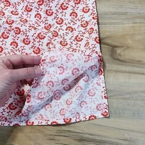 White cotton dress with red floral designs across it. Blue embroidered lining along the pockets, neck, and sleeve hems. Vneck with a tie at the end and cap sleeves, plus two small pockets in the front, & a zipper and clasp closure in the back. Pictured with a necklace which can be found in my closet to add to a bundle.