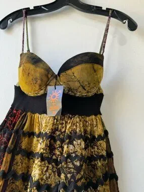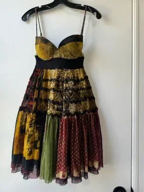 Jean Paul Gaultier mini dress with fitted bust and flared skirt. Features patchwork panels in vibrant prints. Spaghetti straps and banded waist. Flowy, layered hem for movement. Bold, eclectic designer statement.