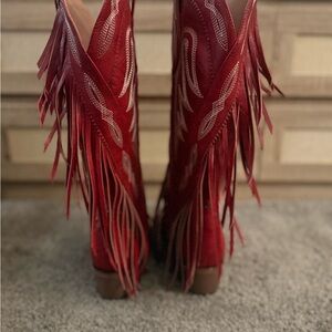 Stylish red western boots with decorative stitching and fringe. Stacked heel for a flattering lift. Pointed toe and classic cowboy silhouette for versatile wear. Bold red color complements denim and dresses. Soft PU man made material.