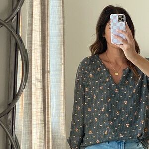 DR2 blouse in slate green with a small floral print. Split V-neck for easy wear. Long sleeves with a relaxed fit. Soft drape for everyday styling.