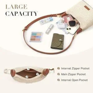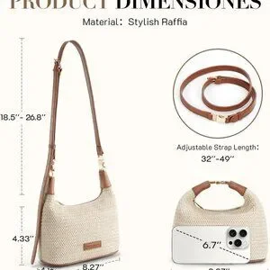 Features: This adorable little bag is made of high-quality handwoven raffia with a durable PU leather bottom that’s water-resistant. It fits all your essentials like phone, keys, cash, and cards, and features a convenient zippered main compartment with an extra open pocket inside.