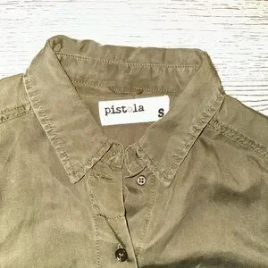 Lightweight utility jumpsuit jacket by pistola. Button-front with two flap chest pockets. Drawstring waist for a customizable fit. Roll-tab sleeves for versatile wear. Classic olive green color for easy pairing.