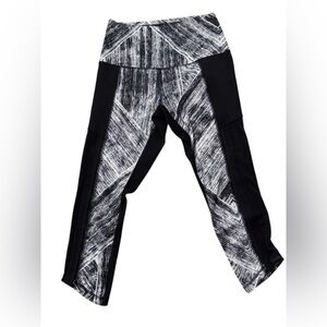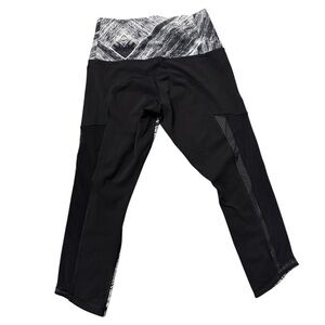 High-rise capri leggings from lululemon athletica. Black side panels with white and gray textured pattern. Cropped length and supportive waistband. Breathable mesh inserts at the calves. Sleek, versatile athletic style.