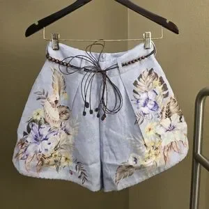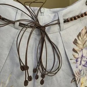 High-waist shorts with painted floral motifs. Pale blue linen blend fabric. Beaded tie belt with leather cords. Soft scalloped hem and feminine drape.