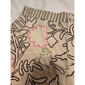 Floral shorts with a striped waist and hem in a earthy palette with pops of pink and bright green. Side pockets..