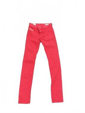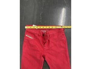 Diesel red skinny jeans. These feature a vibrant red color with a slim fit that contours the legs for a flattering silhouette. The jeans have a button and zipper closure, front and back pockets, and belt loops for added styling options.