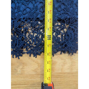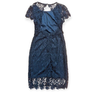 This navy blue Harper dress, size medium, is crafted from 100% polyester lace with a solid lining. It features short cap sleeves, a round neckline, and a knee-length silhouette with a scalloped lace hem. The back of the dress has a cutout open back detail with lace trim and a zipper closure.