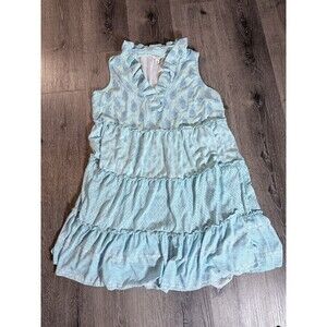 The Crown Ivy Aqua Blue Stripe Tiered Ruffle Collar Midi Dress is a stylish and elegant option for women in size Large. This A-line dress features a collared neckline with ruffle accents, making it perfect for casual occasions in the spring and summer seasons. The blue striped pattern adds a touch of bohemian flair, while the woven cotton blend fabric ensures comfort and durability. With its tiered design and sleeveless cap sleeves, this dress is a chic and trendy choice for any wardrobe.A138