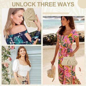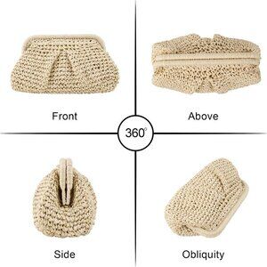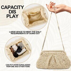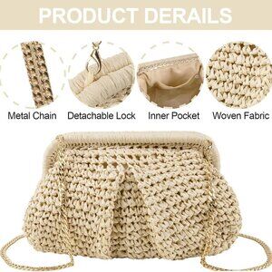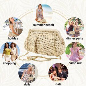 Features: Stylish dumpling-shaped straw clutch with raffia weave, lightweight yet durable. Comes with a detachable metal chain strap so you can carry as a handbag, shoulder bag, or crossbody—versatile and chic. Small pocket inside for your essentials like keys, phone, or lip gloss. Easy to match with your summer outfits for beach trips, brunch dates, or weddings.