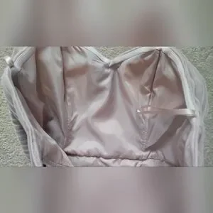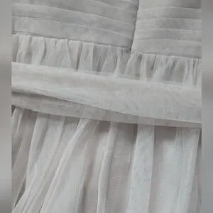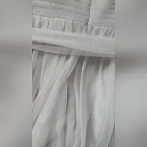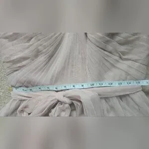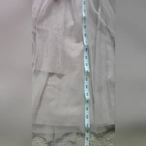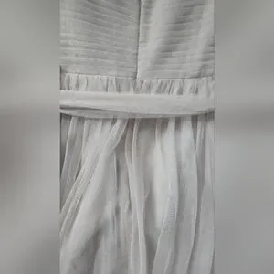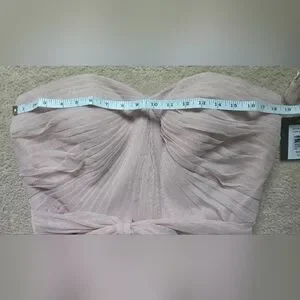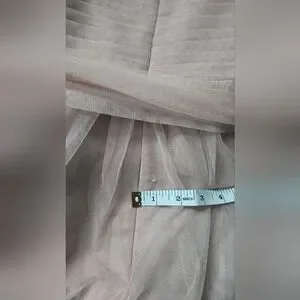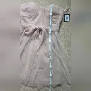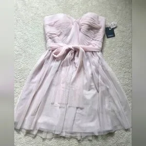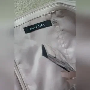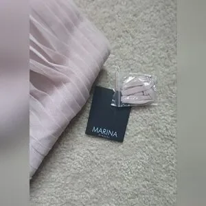 Charming pink dress by Marina, perfect for special occasions. NWT. Size 12. Light powder pink/ballerina pink/dusty pink color. Has light boning in the bust, zips up the back. Tulle sash included. There is a small snag on the back that could be repaired but it does hide in the folds of the tulle and isn't very noticeable. Perfect for prom, date night, formal dances, cocktail hour, wedding guest, or bridesmaid.